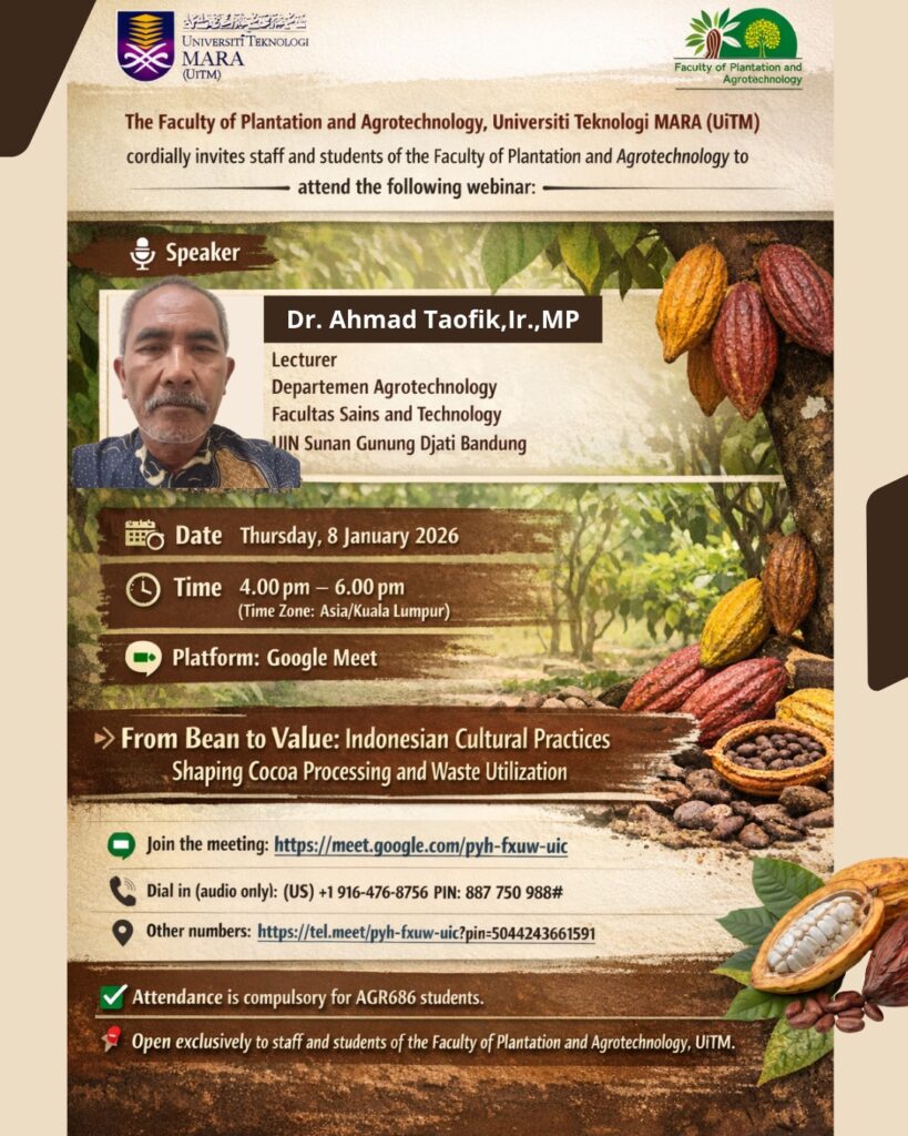 BANDUNG – Dosen Program Studi (Prodi) Agroteknologi, Fakultas Sains dan Teknologi, UIN Sunan Gunung Djati Bandung, Dr. Ahmad Taofik, Ir., MP., hadir sebagai pembicara tamu dalam webinar yang diselenggarakan oleh Fakultas Perladangan dan Agroteknologi, Universiti Teknologi MARA (UiTM), Malaysia. Kegiatan tersebut telah dilaksanakan secara daring pada Kamis, 8 Januari 2026. Kehadiran Dr. Ahmad Taofik dalam […]